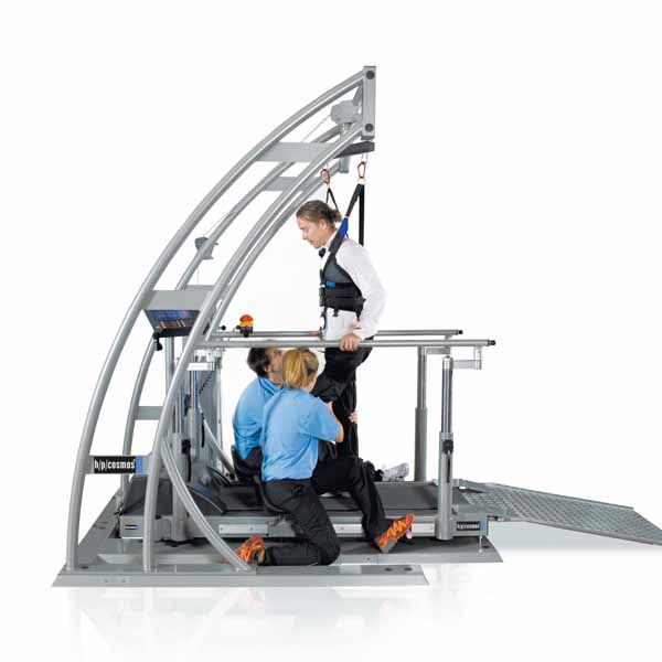 In neurological rehabilitation it is important for the patient to start exercising as early as possible. Therefore an individual and optimal un-weighting system is crucial for the patient. The h/p/cosmos airwalk un-weighting system supports a natural gait pattern. The single-point suspension allows dynamic up and down movement when walking and at the same time allows freedom in movement and body rotations where wanted. Additional fixation straps for further stabilization may be utilized if desired and if recommended for the patient. The un-weighting, depending on the progress of therapy, can be adjusted electronically between 1 kg and 75 kg (2.2 and 165 lbs). The treadmill itself starts at 0.1 km/h speed and is driven by a very powerful 3.3 kW (4.5 HP) drive motor. Even heavy patients at low speeds can exercise smoothly without juddering.
