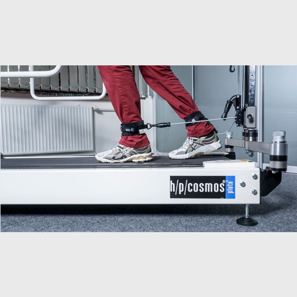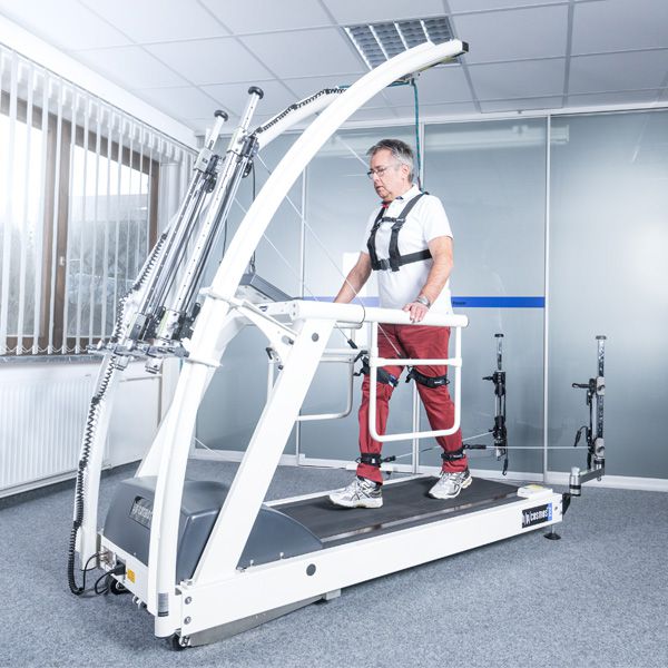 First, elastic cables are attached to patient′s legs with comfortable leg cuffs. As the patient walks on the treadmill, the cables at the front assist the movement of the legs with support. The cables at the rear can be used also for rehabilitation on the treadmill - as resistance and for gait correction training. Both the front and back system can be utilized together for even greater training effects on the treadmill. By adjusting the angle of the support/resistance cables either vertically or horizontally, movement correction is possible. The patented tension adjustment module involves readable scales on each cable for tension monitoring.