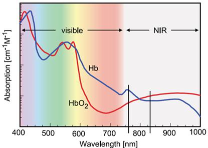 生理組織對光有兩種反應, 一是吸收, 二是散射。血液的主要成分(水, 氧合血紅蛋白和脫氧血紅蛋白)對 600-900 nm 的近紅外光的吸收非常小(水的吸收最小,血紅蛋白的吸收占主導),具有良好的散射性,光子可以從人體頭部表面出發(fā)穿越頭骨到達大腦皮層,因此 600-900 nm 的近紅外光也被稱為光譜窗(見圖1-2 )。在這個光譜窗內(nèi), 脫氧血紅蛋白的吸收峰值在 760 nm 處,氧合血紅蛋白的吸收峰值在 850 nm 處(見圖 1-3)。兩種血紅蛋白在 805nm 附近有一個等吸收點,在 805nm 兩側兩種血紅蛋白分別表現(xiàn)出各自的相對優(yōu)勢吸收特性,故而在等吸收點的左右兩邊分別(至少)選擇一個波長光以保證組織血氧發(fā)生變化時 HbO2 和 Hb 對光吸收的差動效應。2