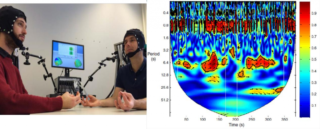 在對(duì)以往的研究發(fā)現(xiàn),與普通的人--機(jī)互動(dòng)相比,人—人之間的互動(dòng)具有更高的生態(tài)效度,此外,與單一被試相比,多被試互動(dòng)能夠更好的理解個(gè)體在人際互動(dòng)中的認(rèn)知能力。所以超掃描為我們?cè)谳^為真實(shí)的社會(huì)環(huán)境中考察了多個(gè)被時(shí)間的大腦互動(dòng)神經(jīng)機(jī)制提供了途徑,使我們可以對(duì)多個(gè)大腦活動(dòng)的活動(dòng)信息進(jìn)行同時(shí)的采集和分析。
