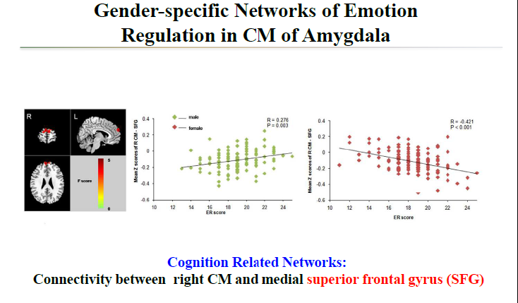 央內(nèi)側(cè)核(C Mof Amygdala)和額上回(Superior frontal gyrus)的連接強(qiáng)度,跟情緒調(diào)節(jié)的分?jǐn)?shù)做相關(guān)性分析以后,在男性里面呈現(xiàn)正相關(guān),女性里面則呈現(xiàn)負(fù)相關(guān)。