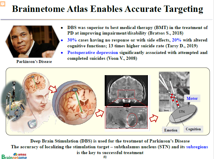 DBS治療的靶點(diǎn)主要在丘腦底核(subthalamus nucleus,STN)。而丘腦底核可以分成三個(gè)不同亞區(qū),分別跟運(yùn)動(dòng)、情緒、社會(huì)認(rèn)知功能有關(guān)。如果電極剛好放在跟運(yùn)動(dòng)有關(guān)的腦區(qū),那么治療效果可能就很好。