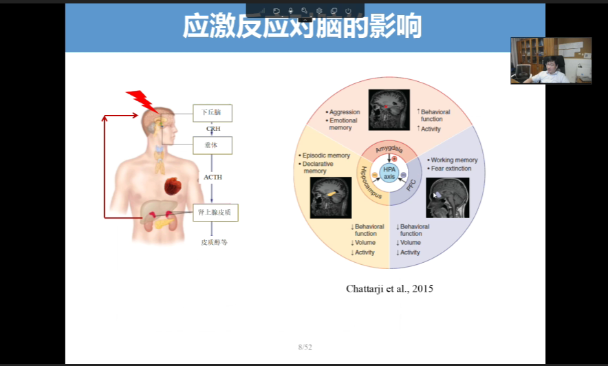 這些負面影響其實很多都是通過大腦來起作用。應激情況下,剛才說能夠產生一個終端產物叫皮質醇。它的分子結構比較小,能夠重新透過血腦屏障回到我們的大腦,會作用于我們大腦的一些靶器官,來對我們的腦功能、心靈產生影響。