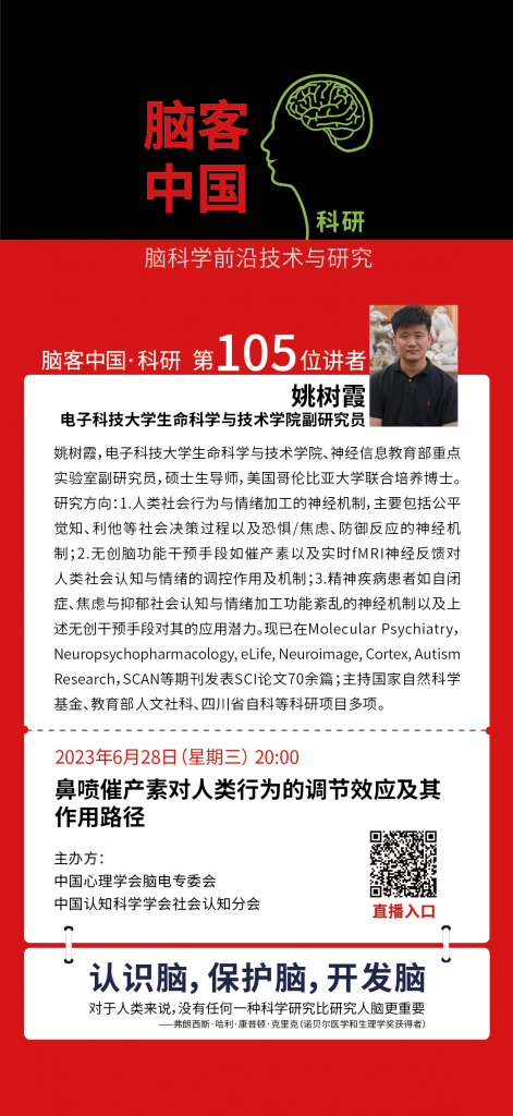 【直播預告】 6月28日晚20點 姚樹霞:鼻噴催產素對人類行為的調節效應及其作用路徑