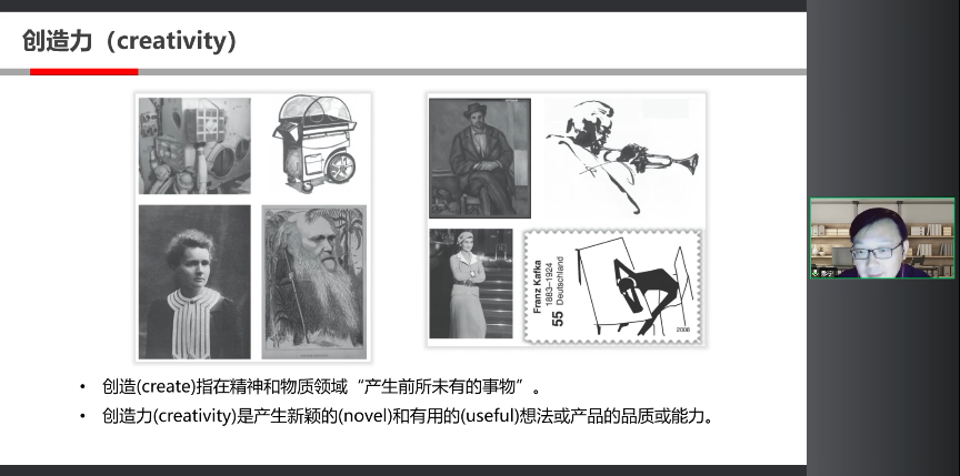 整個人類社會其實就是在不斷的創造性解決問題過程中發展過來的。左邊的圖是一些科學技術領域的創新性事件及創新性人物;右邊則是一些藝術領域當中體現創新性的圖片。基于這些例子我們可以知道,創造是指在精神和物質領域“產生前所未有的事物”,這是亞里士多德定義出來的,與之相關的creativity指的是產生新穎的和有用的想法或產品的品質或能力。這其中有兩個非常重要的關鍵詞,分別是新穎的和有用的。一個東西它既是新的又是有用的,能夠適應當下的環境并且解決問題,那它就是創造性的。