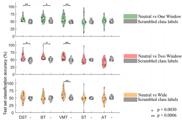 如圖6,結(jié)果表明,不同的教室設(shè)計(jì)條件與參與者的腦電圖數(shù)據(jù)存在一致的變化,而分類(lèi)模型具有預(yù)測(cè)能力,能夠識(shí)別參與者所處的設(shè)計(jì)條件。當(dāng)參與者進(jìn)行視覺(jué)記憶測(cè)試(VMT)時(shí),分類(lèi)器可以成功地識(shí)別與中性條件教室相比的三種設(shè)計(jì)條件(p<0.003)。
