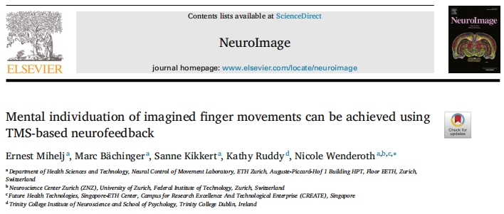 本研究Mental individuation of imagined finger movements can be achieved using TMS-based neurofeedback 發表于2021年的NeuroImage(IF:5.7),來自蘇黎世聯邦理工學院的Ernest Mihelj為第一作者。