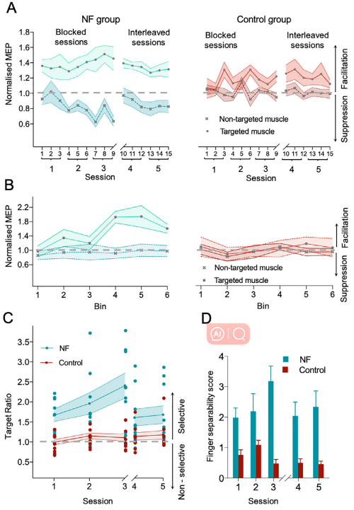 首先比較在訓練過程中,NF組和對照組的MEP波幅的變化(圖2A)。結果發現,兩組在調節靶肌和非靶肌MEP波幅方面存在差異:NF組成功地調節了MI,使靶肌的MEP激活,非靶肌的MEP抑制。在對照組中,靶肌MEP有大于非靶肌MEP的趨勢,但這種差異比NF組小得多,并且在訓練過程中變化較小。