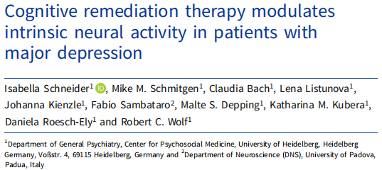 本研究Cognitive remediation therapy modulates intrinsic neural activity in patients with major depression發(fā)表于2019年的Psychological Medicine(IF:6.9)。來自海德堡大學(xué)的Isabella Schneider等人為第一作者。