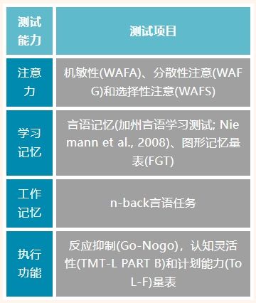 神經(jīng)心理學(xué)基線評估主要采用奧地利的Schuhfried公司研發(fā)、深圳瀚翔腦科學(xué)技術(shù)股份有限公司全國總代理的“維也納心理測試系統(tǒng)”(VTS)。本研究中選取的測試項目如下表所示: