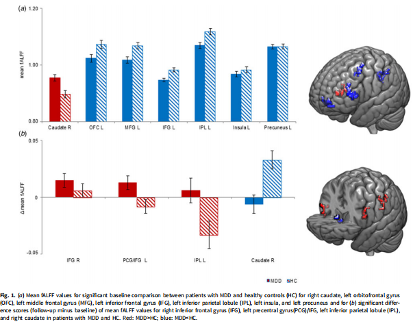 在基線時,與HC組相比,MDD患者右側(cè)尾狀核的fALFF值更大,左側(cè)內(nèi)側(cè)OFC、左側(cè)MFG、左側(cè)IFG、左側(cè)IPL、左島葉和左楔前葉的fALFF值更低。重度抑郁癥中,左內(nèi)側(cè)OFC與認(rèn)知,特別是學(xué)習(xí)和記憶有關(guān)。MFG的內(nèi)在活動與學(xué)習(xí)和記憶有關(guān),這表明MFG基線活動的紊亂與MDD患者的認(rèn)知功能有關(guān)。