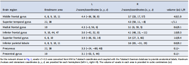 在FNS方面,從11個IC中鑒定出1個IC,與基線對照相比,MDD患者的FNS顯著降低(T36=-2.71, p=0.010)。該部分包括雙側(cè)內(nèi)側(cè)、下額回和中額回、右側(cè)顳上回和IPL、左側(cè)楔前葉和中央前皮質(zhì)(見表4和圖2)。