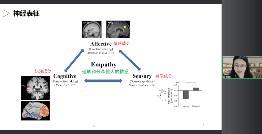 首先我想簡單介紹一下共情的內群體偏向的神經表征以及在神經層面共情的內群體偏向是什么的問題。共情代表的是我們理解和分享他人情感的心理學過程,過去其實已經有很多年的共情研究,對共情尤其是疼痛共情的神經基礎理解的也比較深刻。