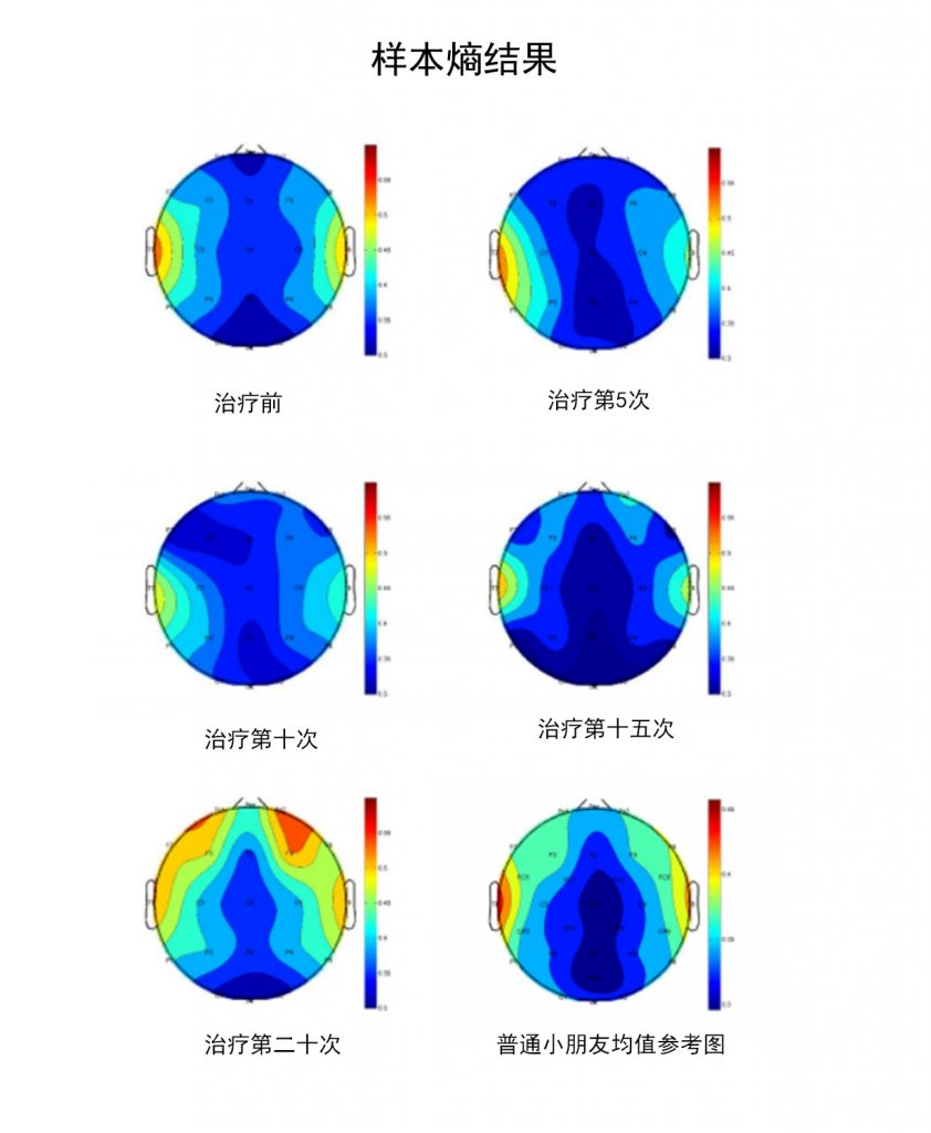 分析:樣本熵代表信息的復(fù)雜程度,紅色代表值較高,藍(lán)色代表值較低。該患者經(jīng)過20次治療后,大腦靈活度提升明顯,更趨近于普通小朋友大腦值。
