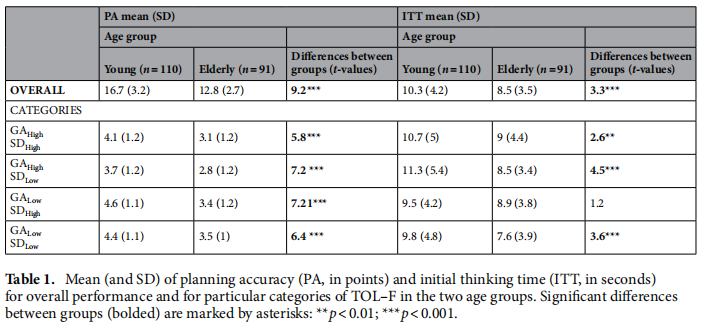 PA在兩組之間的整體表現(xiàn)以及特定類別都存在顯著差異。年輕的參與者比年長的參與者得分更高,反映出年輕人具有更強(qiáng)的計(jì)劃能力(表1)。