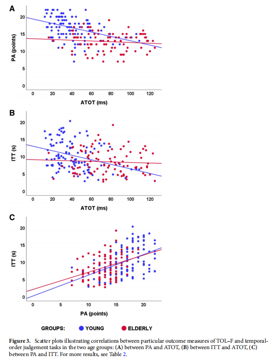 圖3 兩個(gè)年齡組中TOL-F和時(shí)間順序判斷任務(wù)的特定結(jié)果測(cè)量之間的相關(guān)性