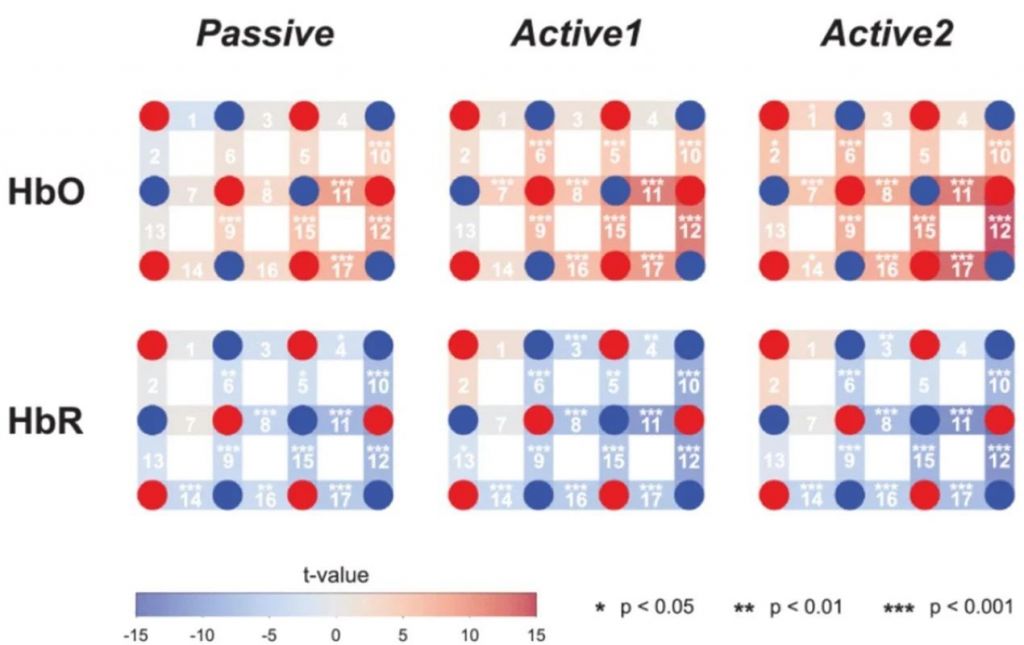 為了對可靠性進行全面的研究,研究人員關注兩個不同的方面。首先,利用線性混合效應模型來估計組級的t值,并采用與受試者級別激活模式類似的方法來構建組級激活模式。通過估計的激活模式,計算決定系數和空間重疊程度兩個指標,評估了受試者和組水平的空間可靠性。結果表明,與被動運動相比,主動運動引發了更強的激活;HbO的簇類空間可靠性優異,HbR的可靠性一般到良好。