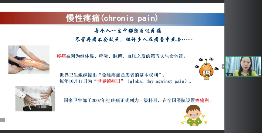 疼痛也被列為繼體溫、呼吸、脈搏、血壓之后的第五大生命體征。每年的10月11號被世界衛生組織列為世界鎮痛日。我們國家衛生部2007年在韓繼生院士的推動下,在全國各個醫院都設立了疼痛科。