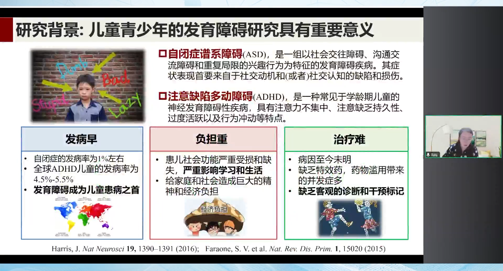 除了我們剛才說到的重型精神疾病。目前我們可以知道很多精神疾病,它的首發(fā)期都是在兒童青少年階段。同時兒童青少年廣泛存在的精神障礙,包括自閉癥譜系障礙和注意缺陷多動障礙。這個也是我們團隊主要關心的兩個方式。它主要是存在一些發(fā)病早,給家庭帶來的負擔重,同時治療比較困難的問題。