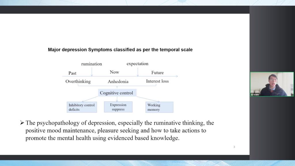 從時(shí)間的角度進(jìn)行分析,當(dāng)更注重的是對(duì)過去的過度思考,我們叫反芻思維;指向當(dāng)下的,就是感覺生活沒有意義,出現(xiàn)快感缺失;以及指向未來的興趣減退。 在這個(gè)框架下想進(jìn)一步去結(jié)合我自己感興趣的認(rèn)知控制方面來去做,采用的技術(shù)就是主持人在前面提到的腦成像和計(jì)算建模來充分解構(gòu)我們這樣的抑郁癥狀。