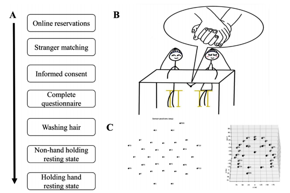 本研究表明,在自然任務中,靜息狀態下的EEG數據能展示人際接觸如何影響大腦同步性。結果發現,靜息狀態的大腦活動具有動態性,且人際接觸在緩解壓力和改變大腦同步性方面表現出兩階段模式,EEG信號的高時間分辨率可能是研究結果的一個關鍵因素。本研究對規劃觸覺干預在社會和醫療護理中的應用具有重要意義。