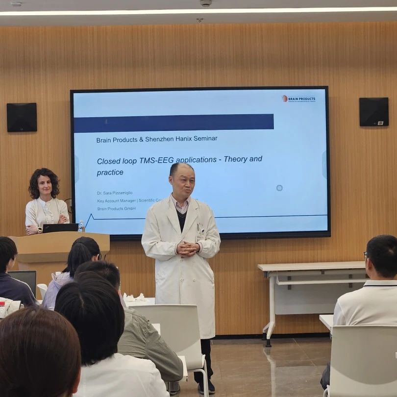 本次研討會邀請到Brain Products科學顧問Dr. Sara Pizzamiglio進行TMS-EEG閉環刺激相關分享。會上,首先由王繼軍教授進行開場致詞,對瀚翔腦科學與Brain Products 公司的大力支持表示衷心感謝,并對與會的各位老師和醫生表示熱烈歡迎。接著,由Dr. Sara向各位醫生、老師、同學,分享了TMS-EEG技術的最新研究成果,還通過實操演示,讓與會者直觀感受到最新的專業閉環刺激套件:Turbolink與bossDevice精準的數據傳輸速度與超高的腦電數據處理預測功能,體現了該技術在實際應用中的強大潛力。