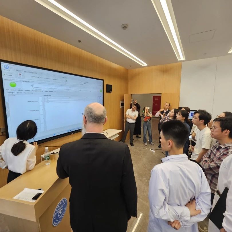 研討會分為理論講解和實操演示兩個環節。在理論講解部分,Dr. Sara從“TMS-EEG閉環刺激的科學動機與技術需求”出發 詳細闡述了TMS-EEG閉環經顱磁刺激能夠實現治療系統和大腦的雙向交互,給定刺激的特定參數影響大腦動力學,同時從大腦讀取的神經生理學數據(如腦電的相位、功率、運動網絡的節點同步),用于調整(后續)刺激的參數,從而使刺激方案更合適個體,也使治療反應最大化。實操演示環節則使用英智科技經顱磁刺激儀(型號:M-100 Ultimate EEG)、Brain Products腦電放大器(型號:actiCHamp Plus)及最新閉環刺激套件Turbolink、bossDevice和bossApp軟件,通過現場操作,一鍵式實現檢測到被試的α峰值后觸發經顱磁脈沖刺激的實驗場景。與會老師同學熱情討論,對技術細節表現出濃厚的興趣。