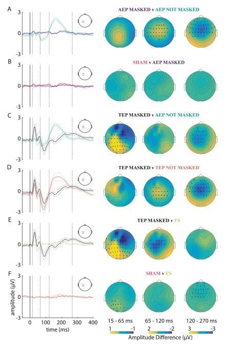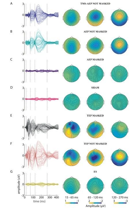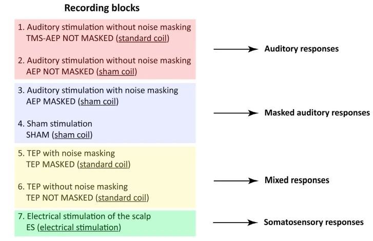 每次TMS脈沖釋放時都會產(chǎn)生明顯的“咔噠”聲音,從而通過空氣和骨傳導引發(fā)聽覺誘發(fā)電位(AEP)。此外,TMS還會在頭皮上產(chǎn)生咔噠感,這可能至少在理論上會誘發(fā)軀體感覺誘發(fā)電位(SEP)。因此有人認為,TEP主要是由TMS中附帶的聽覺和軀體感覺刺激引起的。在這項研究中,比較了具有不同軀體感覺和聽覺成分貢獻的條件下的TEP:真實TMS刺激在有無噪音掩蔽的條件下、純聽覺刺激在有無噪音掩蔽的條件下、頭皮電刺激和偽刺激條件,探討這些混雜因素對刺激初級運動皮層(M1)時誘發(fā)的TEP波形的貢獻。