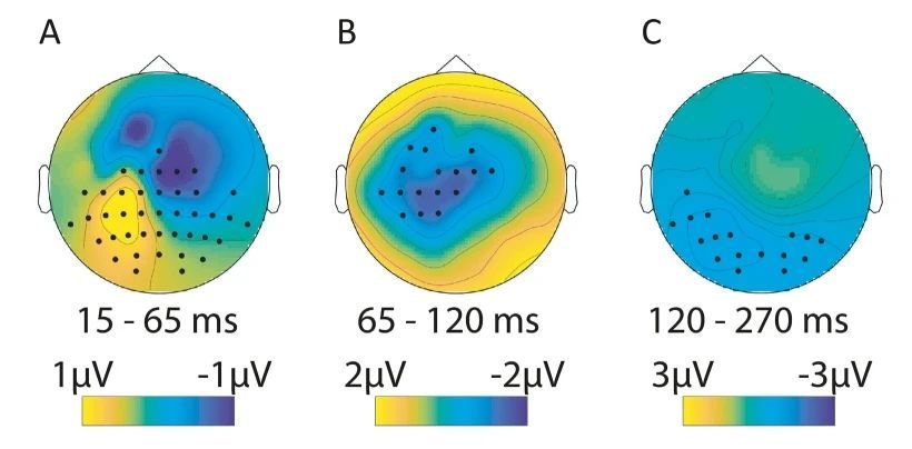 標準線圈誘發(fā)了較大的早期反應,尤其是P30峰值;相比之下,純聽覺刺激誘發(fā)了非常小幅度的早期反應,但在頂區(qū)產(chǎn)生了顯著的N100和P200成分。N100在沒有噪音遮蔽時較大,并位于中線中央?yún)^(qū);只有在沒有噪音遮蔽時,才觀察到中央的P200成分。當前數(shù)據(jù)表明存在兩個不同的負峰,分別在約100毫秒時,這兩個波峰可能涉及不同的機制。第一個負峰靠近刺激位置,可能反映了TMS對大腦皮層的直接激活;第二個負峰則具有更廣泛的分布,主要集中在頂區(qū),并且隨后伴隨著具有相同分布的P200成分。根據(jù)以往文獻,刺激位置處發(fā)現(xiàn)的N100很可能反映了TMS對大腦皮層的直接激活,而中央?yún)^(qū)域的N100和P200則代表了與顯著性相關的多模態(tài)反應(saliency related multimodal responses, SRMR),這些反應是非特異性的,可能與外部刺激后的喚醒和/或注意力重新定向相關。
