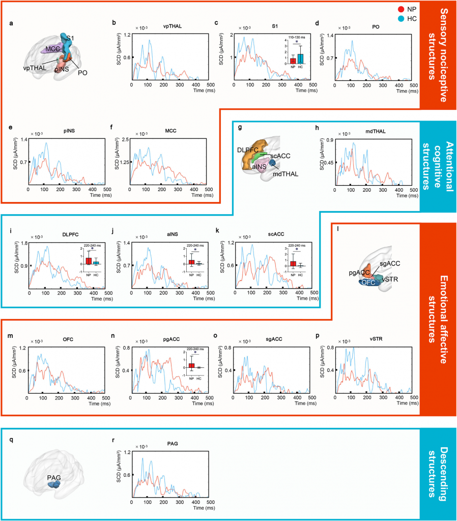 在情感疼痛結構中,神經病理性疼痛患者前扣帶回皮層(pgACC)的局部電流密度顯著高于健康對照組,異常同樣出現在220 - 240ms的時間窗口。這一結果進一步強調了情感疼痛相關腦區在神經病理性疼痛中的異常激活,可能與患者疼痛體驗中的情感成分加劇有關,如焦慮、抑郁等負面情緒的加重。