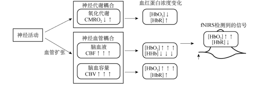 功能性近紅外腦成像技術(shù)(functional nearinfrared spectroscopy, fNIRS)的檢測建立在血氧濃度變化帶來的局部腦組織光學(xué)屬性(如吸收與散射系數(shù))改變的基礎(chǔ)之上。局部腦組織中血紅蛋白濃度的變化會觸發(fā)一系列的復(fù)雜的大腦調(diào)節(jié)活動,根據(jù)神經(jīng)血管耦合假說,這種緩慢變化的血液動力學(xué)響應(yīng)能夠反映局部腦組織內(nèi)的神經(jīng)元活動及其變化規(guī)律。