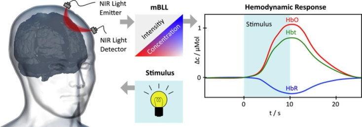 使用近紅外腦成像設(shè)備時,將光源、探測器置于頭部相應(yīng)部位,光源發(fā)射的光進入組織或細胞,在歷經(jīng)一系列吸收、散射事件后,仍會有一部分光子到達皮層表面,探測器可以接收到這些光信號。大腦活動時,神經(jīng)元的代謝發(fā)生變化,導(dǎo)致局部區(qū)域的血流量增加,氧合血紅蛋白HbO的濃度相對升高,脫氧血紅蛋白HbR的濃度相對降低。這會引起近紅外光吸收的改變,被探測器檢測到 。