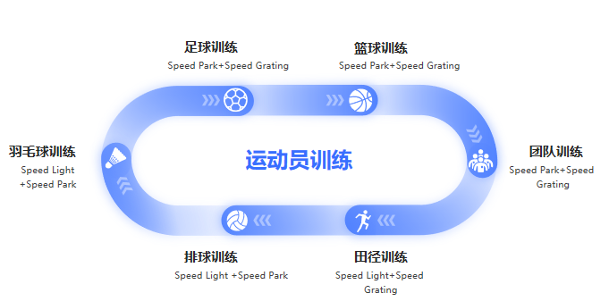 SPEED π 速度靈敏性測試訓練系統包含靈敏反應速度訓練系統(Speed Park)、上肢靈敏反應速度訓練系統(Speed Light)、光柵區間測速系統(Speed Grating)三大組塊,各組塊間相輔相成,致力于提高運動員專項素質能力。