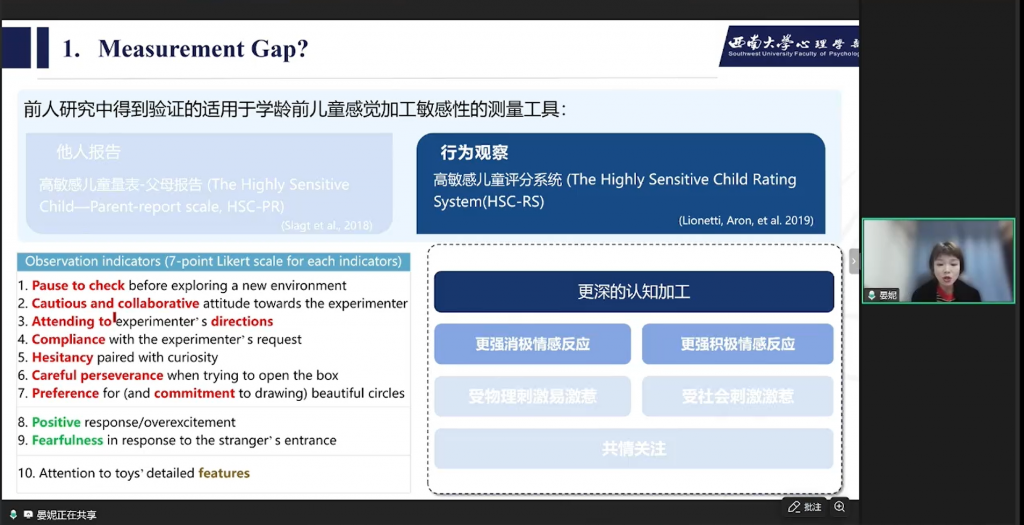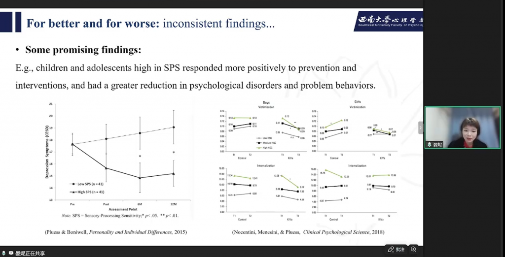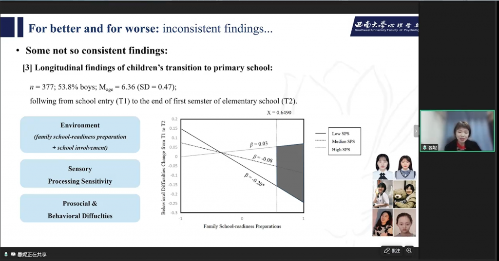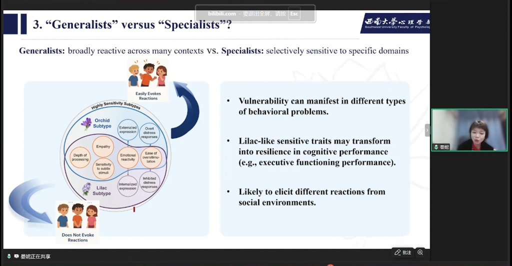 3月12日晚,西南大學心理學部晏妮教授做客腦客中國科研直播間,進行了以“敏感特質與差異發展:構建兒童差別易感性的整合模型”為主題的專業分享。晏妮教授及其團隊近年來聚焦兒童感覺加工敏感性這一核心特質,從核心概念、研究疑問、研究發現三個板塊,探討了兒童在面對家庭環境影響時所表現出的差別易感性機制,并結合實證研究成果展開系統闡述,以下為本次直播的主要內容回顧: