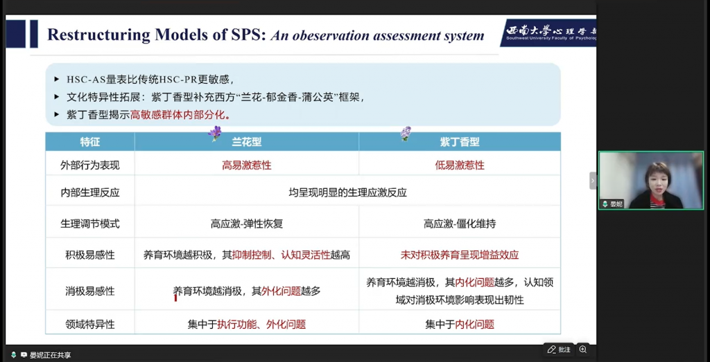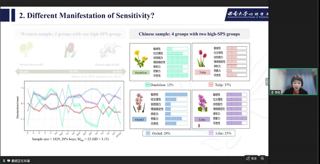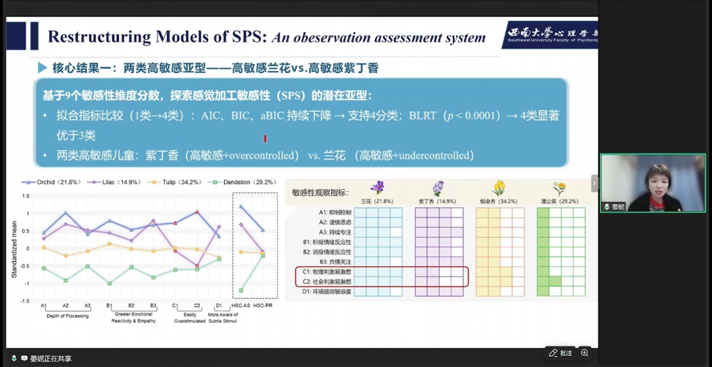 基于新工具研究,得出核心結果:兩類高敏感亞型——高敏感蘭花vs高敏感紫丁香,表現出對物理刺激和社會刺激的易激惹性不一樣;敏感亞型的生理差異,紫丁香型生理反應調節性最差,表現出比較“僵化”的生理調節模式;敏感亞型存在不同的“環境易感性”,在內外化問題、抑制控制、認知靈活性等路徑存在顯著的組間差異。