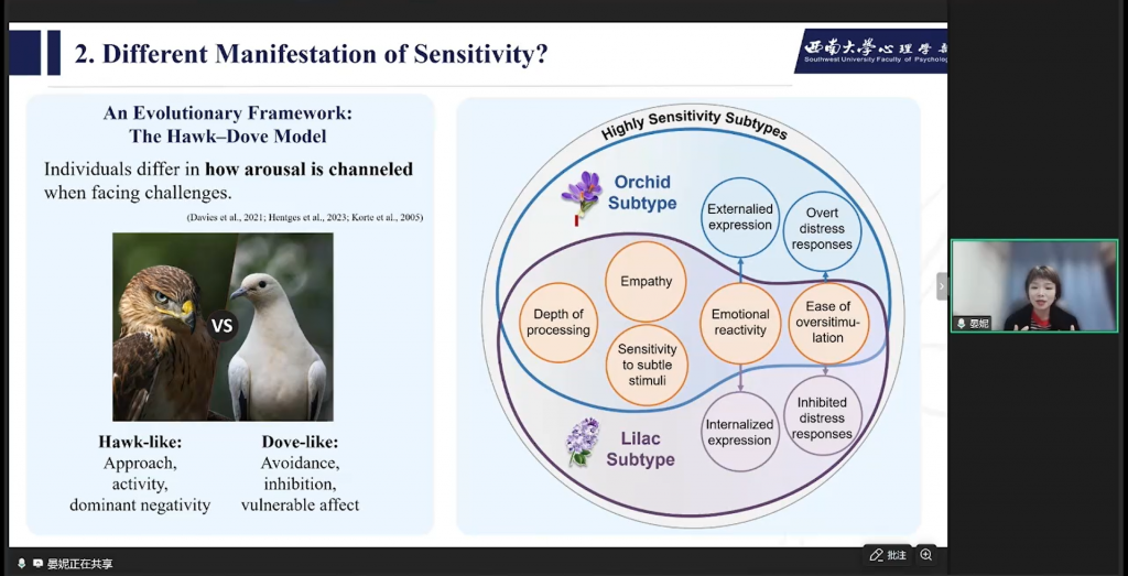 二是敏感性有不同的表現形式/亞型:西方人群存在三類敏感亞型,中國人群則發現兩類,一類社交、自控、情緒穩定性強,另一類易出現情緒爆發。通過進化視角下的“Hawk-Dove Model”思考不同敏感性的特質,不同個體面對環境挑戰時,它的喚醒程度會被不同方式進行調控。
