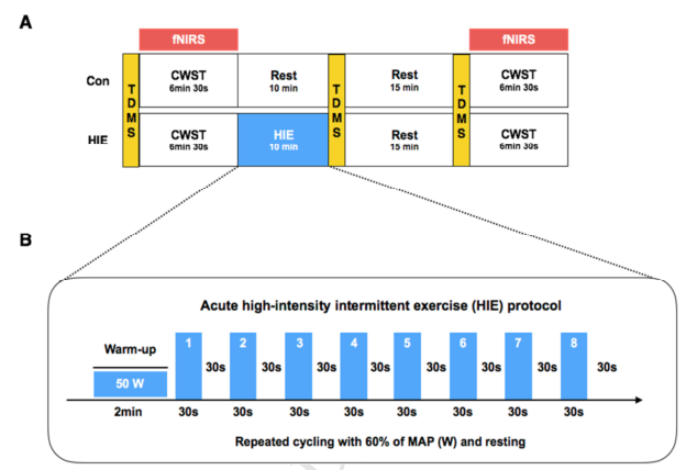 久坐對身體的傷害和認知功能的損傷是公認的,上班族或學生經常保持長久坐姿,引起腰疼、軀體疾病和慢性疾病等癥狀。隨之而來,有人認為久坐后進行運動會緩解或改善久坐所帶來的負面影響,就如目前大家越來越關注高強度的間歇運動(HIE)對心血管和身體代謝所帶來的好處,但是具體高強度間歇運動是怎么影響和潛在作用于認知健康的潛在機制還不甚清楚。本次的研究目的就是為了探究高強度的間歇運動對認知執行功能的影響。