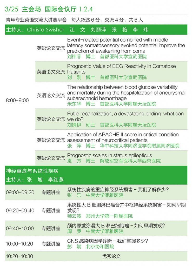 本次會(huì)議主題為“學(xué)術(shù)進(jìn)步與醫(yī)療質(zhì)量控制”,會(huì)議設(shè)定了5 個(gè)專題報(bào)告和14 個(gè)專題講座,以充分展現(xiàn)我國(guó)神經(jīng)重癥團(tuán)隊(duì)學(xué)術(shù)研究成果和臨床實(shí)踐進(jìn)步。會(huì)議邀請(qǐng)了美國(guó)神經(jīng)重癥學(xué)會(huì)前主委Gene Sung 教授、美國(guó)杜克大學(xué)神經(jīng)重癥專家Christa Swisher 教授、澳大利亞重癥專家William Silvester 教授來(lái)華專題講座。會(huì)議保留了2015 年第六屆全國(guó)神經(jīng)重癥學(xué)術(shù)會(huì)議“我的研究我來(lái)講”板塊,為優(yōu)秀神經(jīng)重癥中青年醫(yī)師提供了展示才華的舞臺(tái);保留了2016 年第七屆全國(guó)神經(jīng)重癥學(xué)術(shù)會(huì)議“我的病例我報(bào)告”板塊,圍繞神經(jīng)系統(tǒng)危重疑難病例所引發(fā)的問(wèn)題展開討論;保留了2017 年第八屆全國(guó)神經(jīng)重癥學(xué)術(shù)會(huì)議“我的團(tuán)隊(duì)我的夢(mèng)”板塊,以展現(xiàn)神經(jīng)重癥團(tuán)隊(duì)的研究成果。會(huì)議還新增設(shè)了“青年專業(yè)英語(yǔ)交流大講賽早會(huì)”,并邀請(qǐng)國(guó)內(nèi)外專家點(diǎn)評(píng),以提高神經(jīng)重癥醫(yī)護(hù)人員對(duì)外交流能力。會(huì)議一如既往地安排了“神經(jīng)重癥護(hù)理論壇”,以充分展現(xiàn)神經(jīng)重癥護(hù)理團(tuán)隊(duì)風(fēng)采。