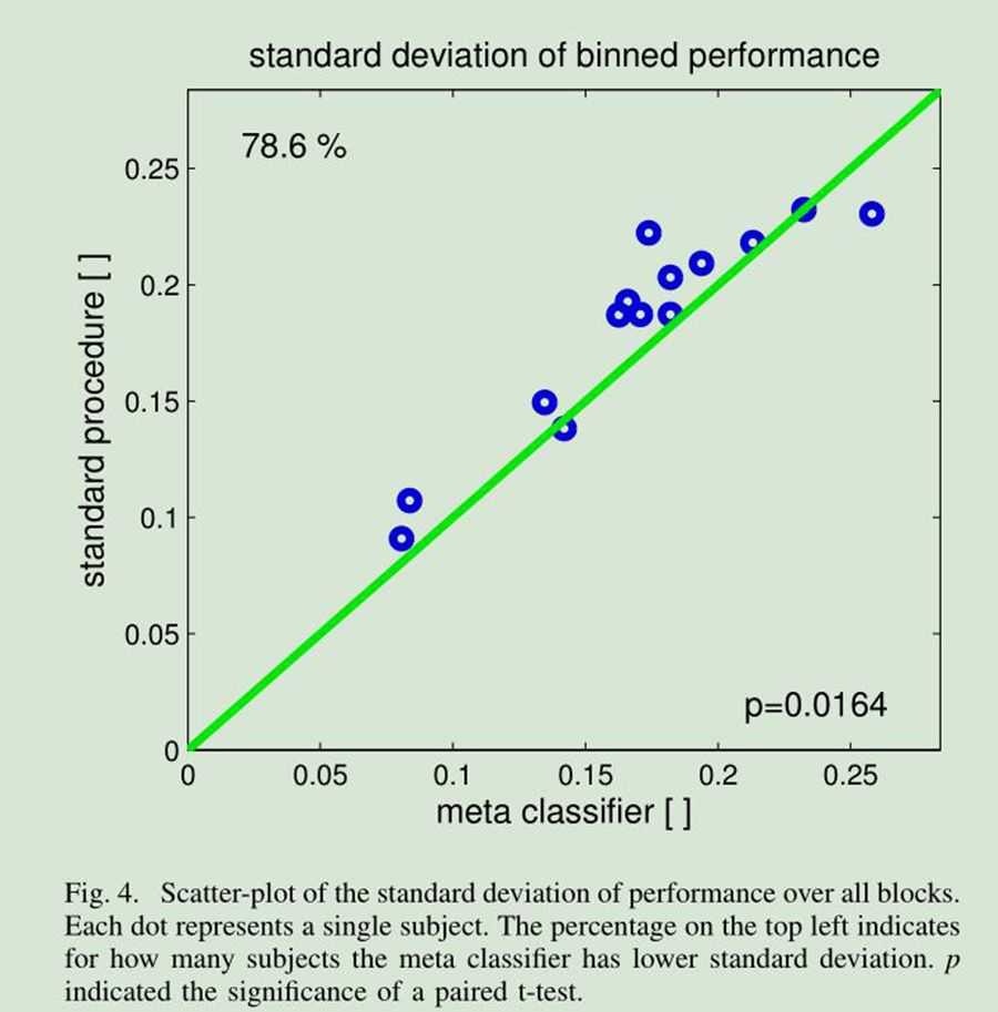 為了評(píng)估我們的方法是否在反饋過程中降低了性能的可變性,我們計(jì)算標(biāo)準(zhǔn)方法的所有60個(gè)Block的標(biāo)準(zhǔn)偏差,所有的試驗(yàn)都是相同的,以及元分類器。圖4顯示了一個(gè)散點(diǎn)圖的結(jié)果。可以看出,我們提出的方法減少了14個(gè)被試中11個(gè)被試:表現(xiàn)的可變性,其中一個(gè)被試的可變性是相同的,而對(duì)于兩個(gè)被試,標(biāo)準(zhǔn)過程的績(jī)效波動(dòng)比較低。配對(duì)樣本T檢驗(yàn)揭示了p小于0.05的顯著關(guān)系。